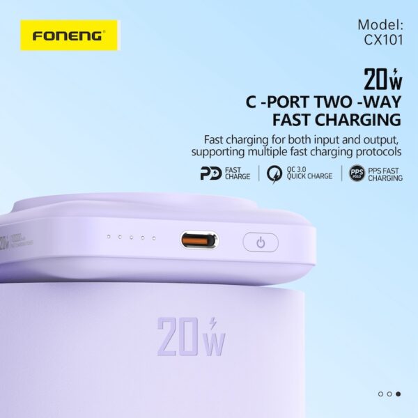 پاوربانک وایرلس 10000 مدل Foneng CX101 یک شارژر همراه مدرن، قدرتمند و کاربردی است که هم بهصورت بیسیم و هم با کابل میتواند دستگاههای شما را شارژ کند. این پاوربانک با ظرفیت 10000mAh، گزینهای بسیار مناسب برای کاربرانی است که در طول روز به شارژ سریع، راحت و بدون سیم نیاز دارند.