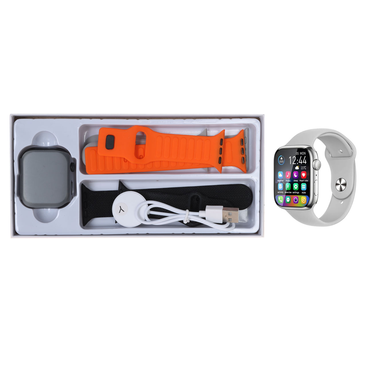 درون جعبه محصول یک دفترچه راهنما، سه عدد بند متنوع و کابل شارژ وایرلسی قرار دارد که امکان استفاده در هر سبک و شرایط را فراهم میکند. تنوع بندها باعث میشود بتوانید ظاهر ساعت را برای استایل رسمی، ورزشی یا روزمره تغییر دهید.