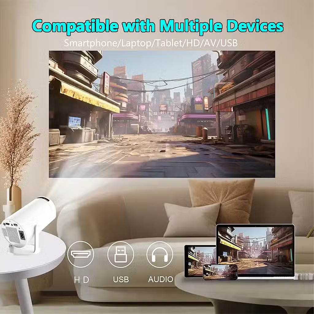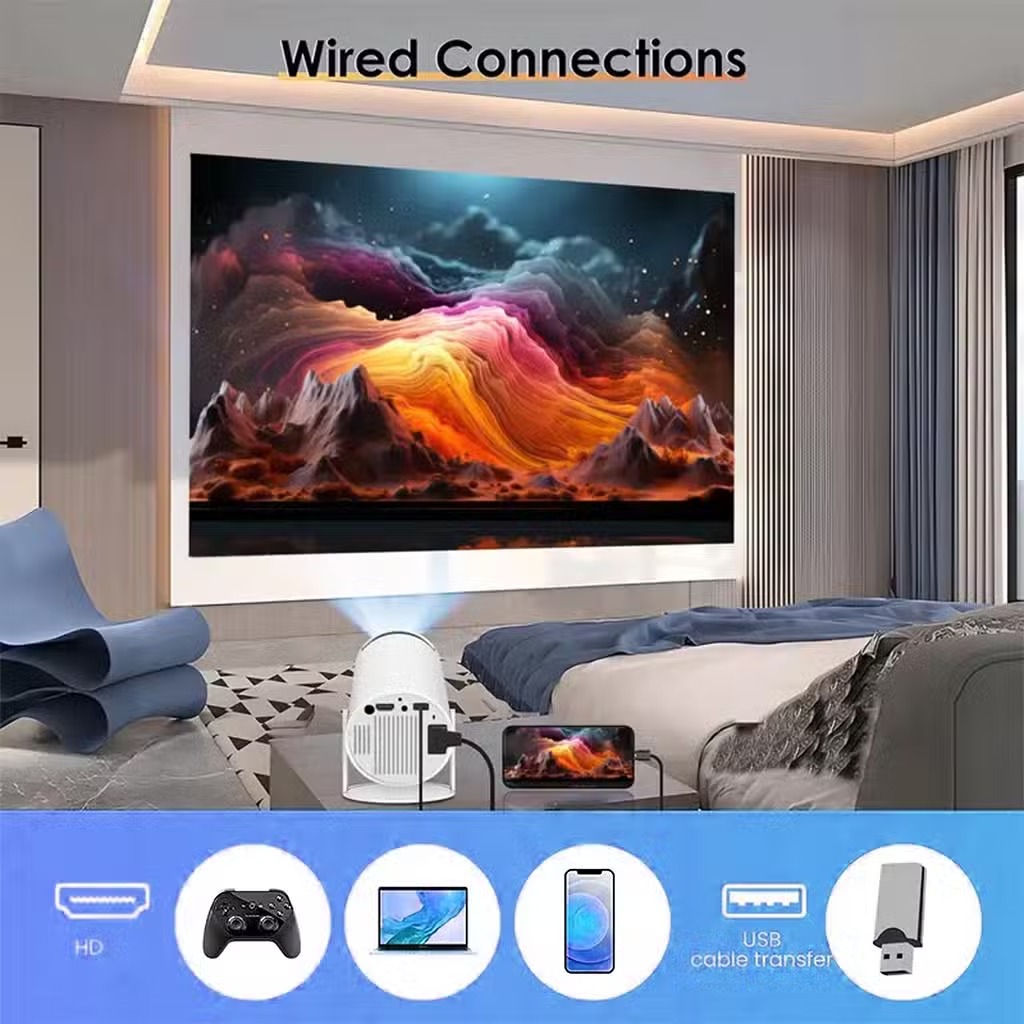 - ویدئو پروژکتور مدل HY300 یک ویدئو پروژکتور کوچک با کیفیت بالا، وزن سبک و قابل حمل آسان برای استفاده در مکان مختلف مناسب است. این ویدئو پروژکتور میتواند تصاویر را با 4K HD و 120 انسی لومن نمایش دهد. به این ترتیب تصاویر پخش شده توسط دستگاه کاملا واضح بوده و رنگ ها به صورت طبیعی و درخشان دیده می شوند. این پروژکتور دارای سیستم عامل Android 11.0 است و بدون نیاز به سیستم لپ تاپ و یا کامپیوتر میتواند مستقیما به اینترنت وصل شود تا بتوانید به راحتی بیش از 4000 برنامه یا محتوای مورد نظر خود را دانلود کنید.با وضوح تصویر بالا به شما تصاویر واضح ارائه میکند. با طراحی زیبا و مدرن خود به شما تجربه سینمایی فوق العاده در خانه می دهد، فیلم تماشا کنید و از مهمانی ها لذت ببرید. از قابلیت های مهم این دستگاه اتصال بیسیم آن هست که میتوانید گوشی های اندرویدی و آیفون خود را به طور مستقیم و بدون سیم به آن متصل کنید و تصویر دیوایس خود را روی پرده یا دیوار نمایش دهید (این قابلیت برای ویندوز نیز موجود هست.