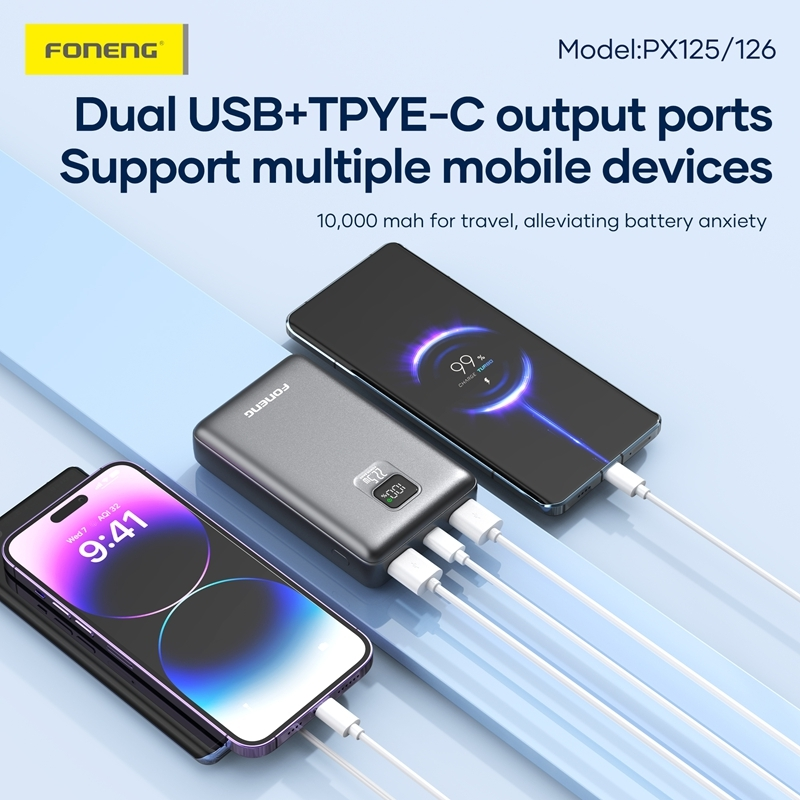 پاوربانک Foneng PX126 ظرفیت ۲۰۰۰۰mAh یک شارژر همراه قدرتمند و کاربردی است که برای شارژ سریع و مطمئن انواع گوشیهای هوشمند، تبلتها و دیگر دستگاههای دیجیتال طراحی شده است. این پاوربانک با ظرفیت بالا میتواند چندین بار دستگاههای موبایل شما را شارژ کند، بنابراین برای سفر، استفاده روزمره، محل کار و مواقع اضطراری یک همراه مطمئن محسوب میشود.