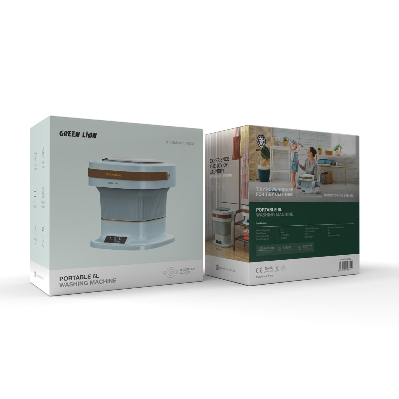 ماشین لباسشویی Green Lion 6L با طراحی تاشو و پرتابل، ظرفیت ۶ لیتر دارد، دارای قابلیت شستوشوی سریع در چرخه ۴، ۵ یا ۱۰ دقیقهای است و فناوری Blue‑Light ضدباکتریایی نیز در آن پیشبینی شده است. توان مصرفی ۳۶ وات و دور آبگیری ۳۰۰ RPM همراه با ولتاژ جهانی، از برترین ویژگیهای این دستگاه است.